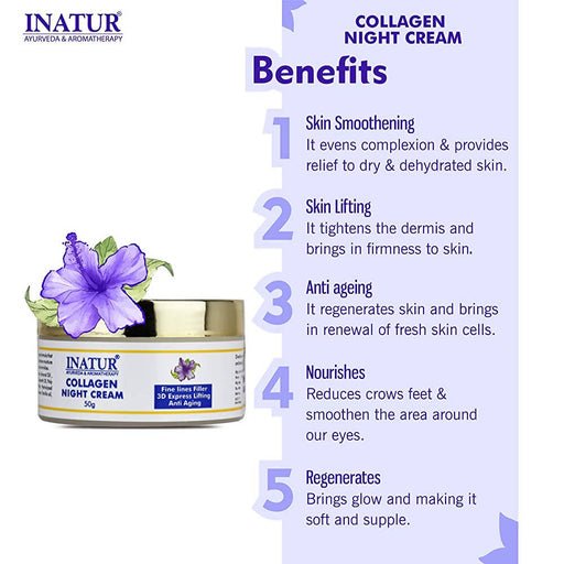 Inatur Collagen Night CreamIngredients:Soya, Saffron Hibiscus, Patchouli, Vanilla oil, Manihot.Directions to Use:Apply on to dry face and neck just...