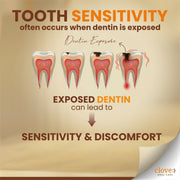 • What is tooth sensitivity? Tooth sensitivity occurs when the enamel that protects our teeth gets thinner or when gum recession occurs, exposing the underlying surface, the dentin thus reducing the protection of the root and nerves. When such teeth come in contact with something hot, cold, or sweet, sensations are carried directly to the nerves causing painful sensitivity. Causes for enamel wear and tear: Aggressive brushing, Tooth grinding, Teeth erosion Causes for gum erosion: Aggressive brushing, aging, gum disease. Clove sensitive toothpaste, provides RELIEF from tooth sensitivity with regular use. How to use: Use it like regular toothpaste, twice a day. Apply directly on sensitive teeth for relief. We recommend that you use a toothbrush specially designed for sensitive teeth along with this Clove Sensitive toothpaste. You can also explore the Clove Oral range of toothpaste.