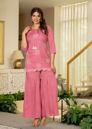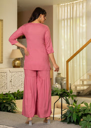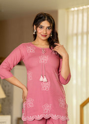 Juniper Dusty Pink Solid Viscose Tunic And Pants Co-Ord Set With Thread Work And Sequence