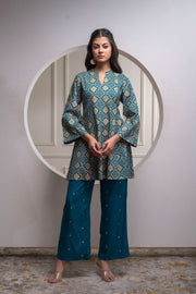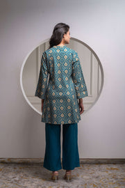 Embrace festive vibes with this teal kurta-pant set featuring a floral printed A-line kurta with a V-neck and 3/4 sleeves, paired with solid ankle-length pants with a parsley waistband. Crafted in breathable 100% viscose for all-day comfort.Legal Disclaimer :Product color may slightly vary due to photographic lighting sources or your monitor settings.