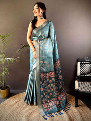 Teal Blue Gold Zari Chanderi Phulkari Floral Saree