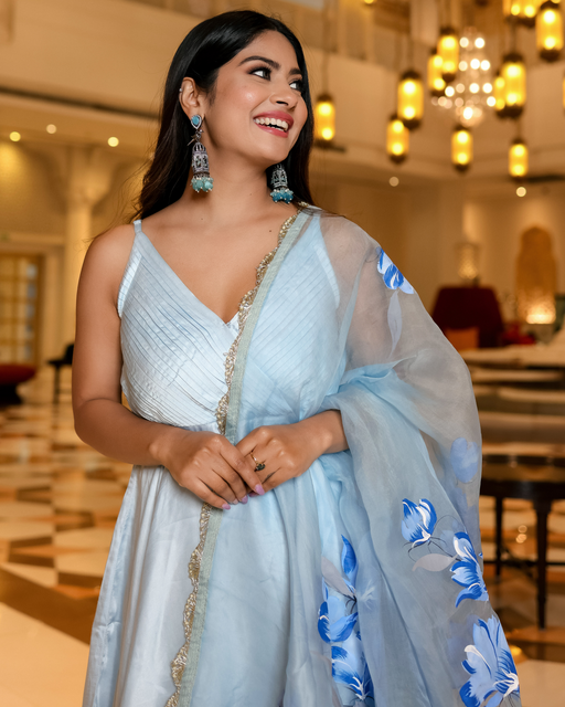 This three-piece Handpainted Sharara set. Color: Blue Kurta Fabric: Modal Satin Sharara Fabric: Modal SatinDupatta Fabric: Pure Organza Neckline: V...