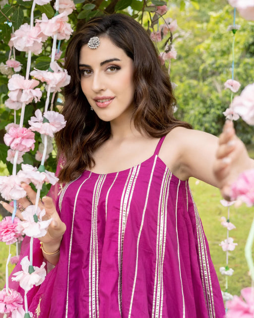 Be ready to stun with our Injila Gotapatti Sharara Set. Handcrafted in a bold magenta pink color, the heavily gota-embellished kurta with equally s...
