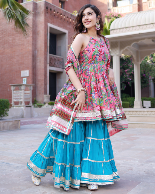 View full detailsFusion Floral Handblock Gota Sharara Set