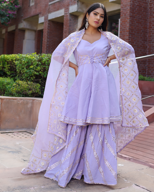 This three-piece set includes a kurta, sharara & dupatta.Kurti Description – Lilac coloured flared Gota Kurti embellished with gotta jaal .Shar...