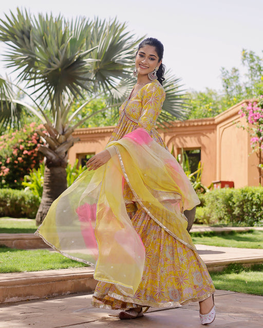 Our Asharfii Shibori Sharara Set comes with a shibori patterned sharara with a floral jaal print short kurti in a bold yellow tone. The dupatta is ...