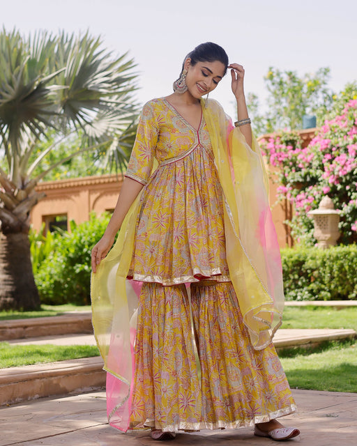 This three-piece Gota Patti Sharara suit set. Color: Mustard/PinkSuit Set Fabric: RayonDupatta Fabric: Organza Neckline: V neck Sleeve: Elbow Slee...