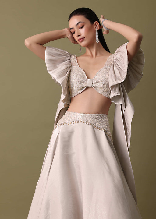 For an effortless three-piece moment, this cream crepe crop top and printed skirt set layers in a beaded, sequin-worked cape for extra drama. The p...