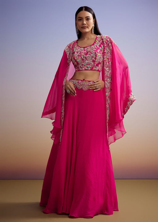 This pink outfit features a resham embroidered crop top and flared skirt, layered with an organza cape for added elegance. The sleeveless round-nec...