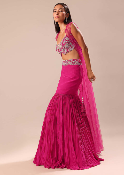 View full detailsPink Organza Crop Top And Skirt Set With Embroidered Cape