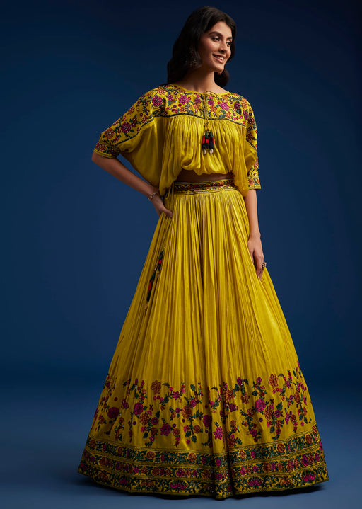 Mustard Silk Blend Crop Top And Skirt With Resham Work