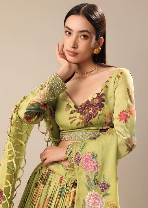 Make a bold statement with our verdant green blouse and skirt, adorned with zardosi work and floral prints. This ensemble is fabricated on a cre...