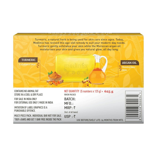 Medimix Ayurvedic Tumeric & Argan Oil Bathing BarAbout the Product: Quantity: 625g (Each 125g). package content: 5 Soaps. Item Form: Solid Targ...