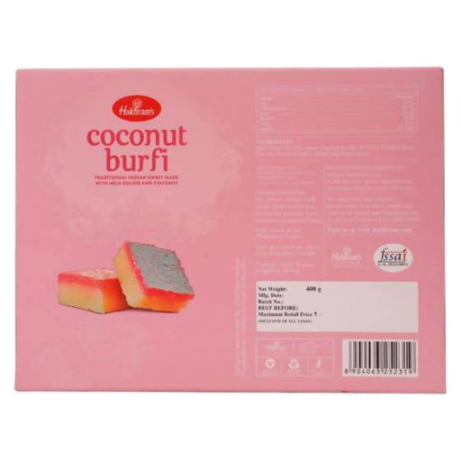 Haldiram's Coconut Burfi Traditional Indian Sweet made with Coconut, Khoya, and Sugar. Ingredients: Milk Solid Coconut Powder Pistachios Silver Le...