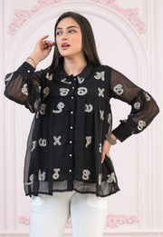 Turn heads in this black satin embroidered sheer tunic by Surface Trends. Crafted from poly georgette, it features elegant thread and sequin detailing, full sleeves, a mandarin collar, and a flattering fit and flare silhouette with button accents.Legal Disclaimer :Product color may slightly vary due to photographic lighting sources or your monitor settings.