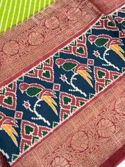 This exquisite Green Silk Blend Lehriya Saree is a harmonious blend of elegance and tradition, designed to captivate. The body of Green Silk Blend Lehriya Saree showcases a striking royal blue base adorned with delicate white diagonal stripes, exuding a timeless charm. The border and pallu of Green Silk Blend Lehriya Saree are enriched with intricate maroon and gold woven patterns, embodying classic craftsmanship. A vibrant tapestry of parrot motifs in green and orange, surrounded by geometric and floral accents, adds a lively and artistic touch to the design.
