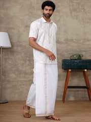 Men Cream Matching Border Dhoti With Printed Shirt Set Fusion PS1