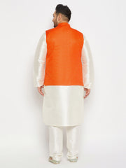 Men's Plus Size Orange Matka Silk Nehru Jacket With Cream Silk Blend Kurta And Pant Style Pyjama Set