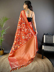 This exquisite Soft Silk Kalamkari Print Saree showcases the perfect blend of tradition and artistry.The rich pallu is adorned with intricate Kalamkari prints through detailed motifs and vibrant colors. The body of the saree presents a sophisticated harmony of traditional designs, while the border boasts fine gold zari weaving, enhancing the overall opulence. Ideal for festive occasions.