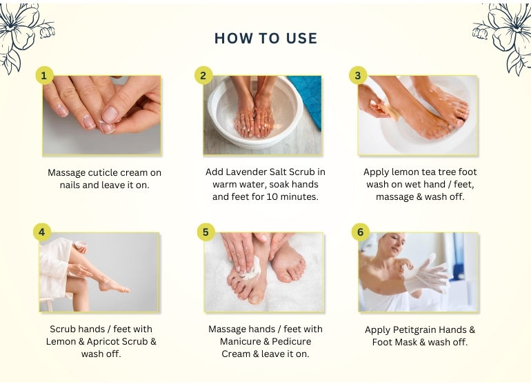 • Step 2: Add lavender salt into mani-pedi tub. Let it dissolve and then soak your hands or feet for 8-10 mins