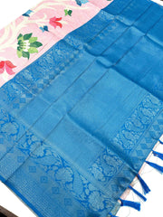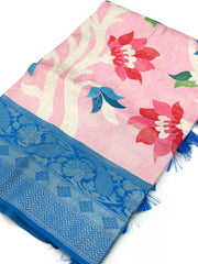 This elegant Elegant Pink Lotus Print Saree radiates charm with its soft pink base, adorned with a vibrant floral design.The contrasting blue border adds depth and sophistication, featuring intricate floral motifs and a subtle chevron design. The Elegant Pink Lotus Print Saree delicate color palette and graceful details make Elegant Pink Lotus Print Saree an ideal choice for festive occasions.