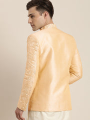 Beige color embroidered smart looking bandhgala jodhpuri blazer, has a mandarin collar, full sleeves, a welt pocket with pocket square .