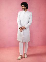 Contemporary grey silk blend sherwani with Kenzo jacquard and floral patterns, paired with cream satin pyjama. Features concealed closure and elegant design for modern celebrations.