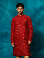 Thread work all over embroidered silk blend kurta with sequins embellishment. Straight knee length , has a mandarin collar, long sleeves, straight hem and side slits.