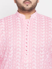 Pink color chikankari embroidered straight knee length kurta, has a mandarin collar, long sleeves, button placket, straight hem.