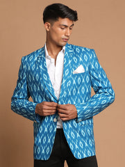 Turquoise Blue ikkat printed slim-fit smart looking blazer has notch collar, long sleeves, regular lengths, straight hem, three welt pocket with pocket square.