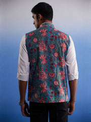 Aqua Blue color printed Pure Cotton Nehru Jacket.