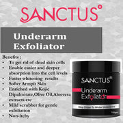 A well calculated composition of natural ingredients along with a mild scrubber, Sanctus Underarm Exfoliator works like a charm on dirt and impurities. Specifically designed for the underarms, it has a gentle and delicate formula suitable even for extremely sensitive skin. Formulated using kojic palmitate, glycerine, olive oil and aloe vera, this exfoliator helps in the quintessential skin brightening process. Exfoliation plays a huge role in cleansing the skin before the application of skin brightening products. This process removes any dead skin cells on the skin's surface and makes the cream gets easily absorbed. Once inside the skin, the ingredients in the cream work effectively and gives you a brighter and lighter skin. The scrubber added is very mild and least likely to cause irritation.