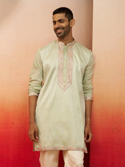 Stand out with Vastramay's pista green silk blend mid-length kurta featuring concealed placket with beautiful Kashmiri stitch machine embroidery on collar and placket. Mandarin collar design, thigh length with side slits and functional inseam pockets. Perfect for Navratri, weddings, Durga Puja, and vibrant festive celebrations.