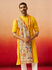 Stand out with Vastramay's yellow cotton kurta featuring distinctive high neck with geometric thread embroidery and digital print figures on collar and placket. Side placket design with button closure, knee-length with side slits and practical inseam pockets. Perfect for Durga Puja, Navratri, and festive celebrations requiring unique traditional styling.