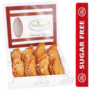 A beautiful box containing Sugarfree Gujiya Sweets which is a refined flour pastry stuffed with dryfruits cardamom and mawa dipped in sugar Subsitute Syrup.