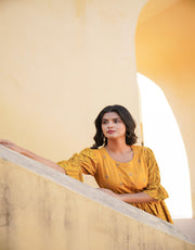 Mustard Ethnic Motif Printed Viscose Short Dress With Dori. The Dress Is Knee-Length, Fit And Flare, Featuring A Round Neck And Three-Quarter Sleeves.