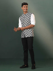 Black color ikkat print Nehru jacket has mandarin collar, welt pockets, two side pockets, waist length.