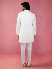 Contemporary cream fine satin kurta with modern pant styling. Features concealed placket, mandarin collar, and comfortable fit perfect for formal and festive occasions.