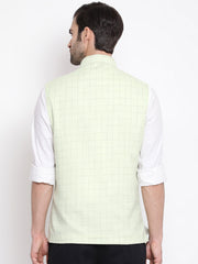Mint green woven checked Nehru jacket, has a mandarin collar, a full button placket, sleeveless, a welt pocket