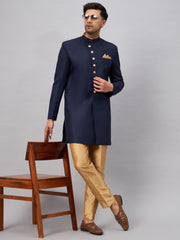 Navy Blue Solid Sherwani With rose gold Solid Pant style pyjama set.