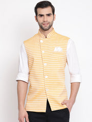 Orange and white woven stripe angrakha style Nehru jacket, has a mandarin collar, a full button placket, sleeveless, a welt pocket