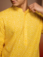 Brighten your festivities with Vastramay's yellow bandhani printed kurta set. Premium cambric cotton with cheerful bandhani screen print, concealed placket, and comfortable white pyjama for summer celebrations.