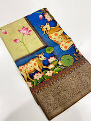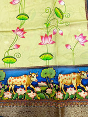 Pista Pichwai Pure Viscose Dola Saree, enriched with exquisite Zari Weaving and a resplendent Rich Pallu.The intricate Kalamkari Print adorning the fabric. Each motif intricately woven into the fabric,creating a mesmerizing tapestry of colors and patterns that captivates the eye. Pista Pichwai Pure Viscose Dola Saree Adding to its allure is the masterful Zari Weaving, creating shimmering accents that catch the light and exude a regal aura.This rich pallu adds a touch of grandeur and sophistication to the overall look, Pista Pichwai Pure Viscose Dola Saree making it suitable for special occasions and events.