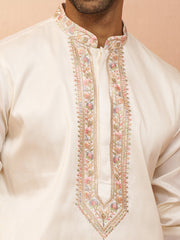 Experience premium craftsmanship with Vastramay's off white silk blend mid-length kurta featuring concealed placket with exquisite Kashmiri stitch machine embroidery on collar and placket. Mandarin collar design, thigh length with side slits and practical inseam pockets. Perfect for Navratri, weddings, Durga Puja, and sophisticated festive celebrations.