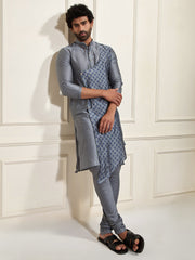 A sleek,long-sleeve kurta made from a shiny, smooth fabric, offering a luxurious feel. It has a mandarin collar for a modern touch and an asymmetrical layered design with a printed overlay featuring subtle patterns, enhancing its elegance.This ensemble is perfect for weddings, receptions, festivals, and cultural celebrations, making it an eye-catching and versatile outfit for modern men.