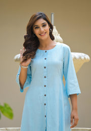 Juniper Powder Blue Solid Cotton Linen Kurta With Button Closure