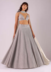 Oyster Grey Embroidered Lehenga Set In Knit With Choker Dupatta