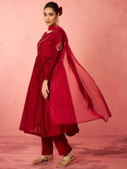 Experience luxury with Vastramay's maroon silk blend anarkali kurta set. Features exquisite zardozi embroidery with ethnic motifs on premium silk fabric, paired with comfortable cotton straight pant and elegant chiffon dupatta.