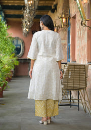 White floral printed cotton A-line Kurta Pant And Dupatta Set, featuring a calf-length design with a fit & flare silhouette. This set includes a V-neckline, three-quarter regular sleeves, and slip-on printed pants. Complemented with a printed dupatta, it offers a fresh, elegant look perfect for any occasion