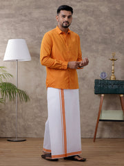 Men Orange Matching Border Dhoti & Full Sleeves Shirt Set Evolution IC1
